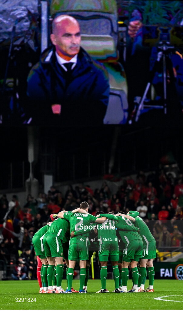 13 November 2025; Republic of Ireland players huddle as Portugal head coach Roberto Martínez is shown on the big screen before the FIFA World Cup 2026 Group F Qualifier match between Republic of Ireland and Portugal at the Aviva Stadium in Dublin. Photo by Stephen McCarthy/Sportsfile