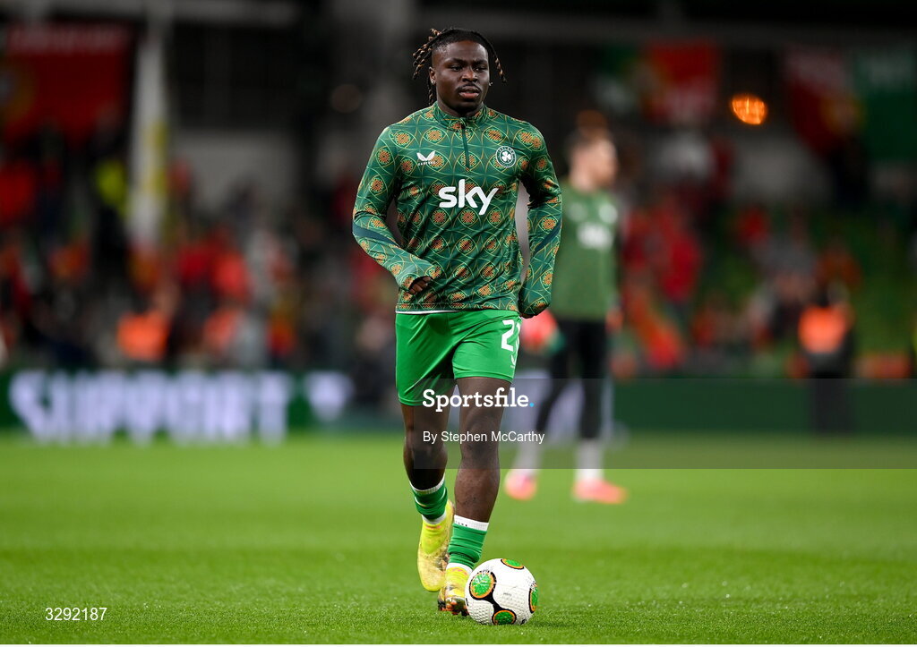 13 November 2025; Festy Ebosele of Republic of Ireland warms up before the FIFA World Cup 2026 Group F Qualifier match between Republic of Ireland and Portugal at the Aviva Stadium in Dublin. Photo by Stephen McCarthy/Sportsfile