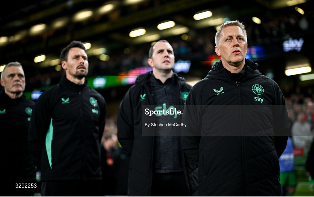13 November 2025; Republic of Ireland head coach Heimir Hallgrimsson, right, with coaches, from right, assistant head coach John O'Shea, assistant coach Paddy McCarthy and goalkeeping coach Gudmundur Hreidarsson before the FIFA World Cup 2026 Group F Qualifier match between Republic of Ireland and Portugal at the Aviva Stadium in Dublin. Photo by Stephen McCarthy/Sportsfile