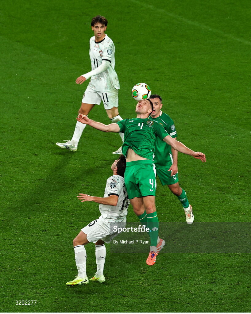 13 November 2025; Dara O'Shea of Republic of Ireland in action against Joao Neves of Portugal during the FIFA World Cup 2026 Group F Qualifier match between Republic of Ireland and Portugal at the Aviva Stadium in Dublin. Photo by Michael P Ryan/Sportsfile