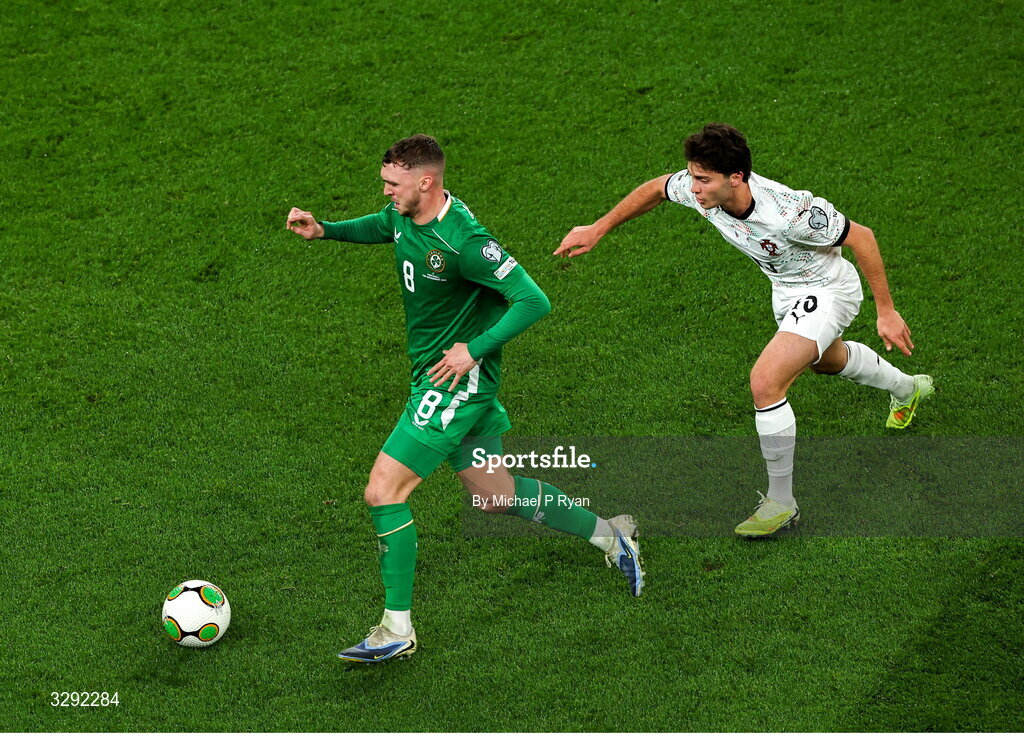 13 November 2025; Jack Taylor of Republic of Ireland in action against Joao Neves of Portugal during the FIFA World Cup 2026 Group F Qualifier match between Republic of Ireland and Portugal at the Aviva Stadium in Dublin. Photo by Michael P Ryan/Sportsfile