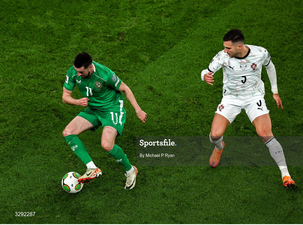 13 November 2025; Finn Azaz of Republic of Ireland in action against Diogo Dalot of Portugal during the FIFA World Cup 2026 Group F Qualifier match between Republic of Ireland and Portugal at the Aviva Stadium in Dublin. Photo by Michael P Ryan/Sportsfile