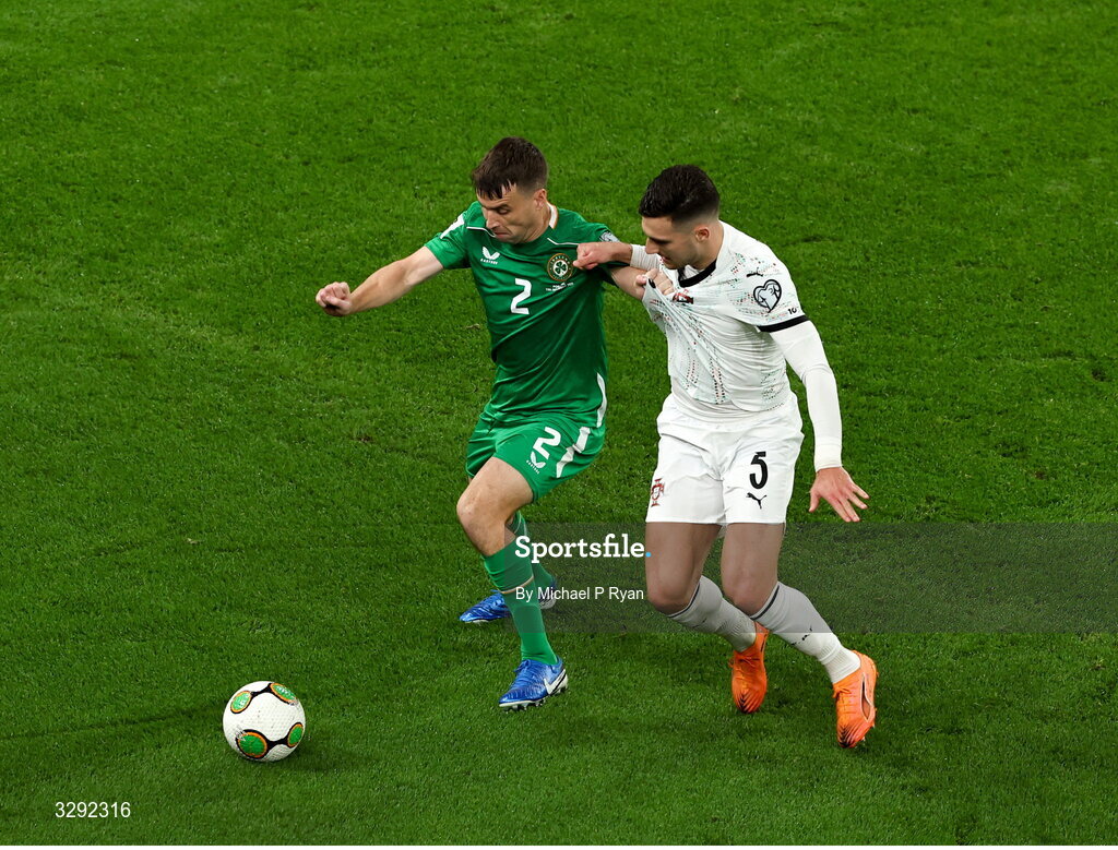 13 November 2025; Seamus Coleman of Republic of Ireland in action against Diogo Dalot of Portugal during the FIFA World Cup 2026 Group F Qualifier match between Republic of Ireland and Portugal at the Aviva Stadium in Dublin. Photo by Michael P Ryan/Sportsfile