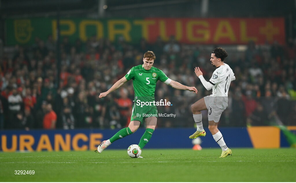 13 November 2025; Jake O'Brien of Republic of Ireland in action against Vitinha of Portugal during the FIFA World Cup 2026 Group F Qualifier match between Republic of Ireland and Portugal at the Aviva Stadium in Dublin. Photo by Stephen McCarthy/Sportsfile