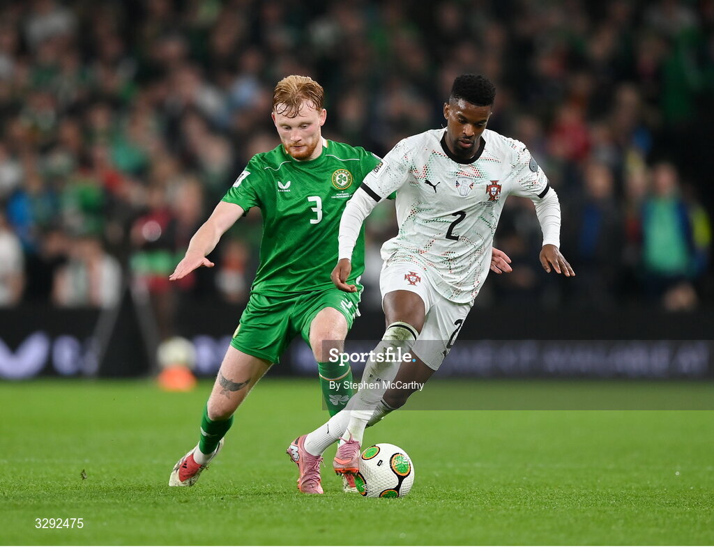 13 November 2025; Nélson Semedo of Portugal in action against Liam Scales of Republic of Ireland during the FIFA World Cup 2026 Group F Qualifier match between Republic of Ireland and Portugal at the Aviva Stadium in Dublin. Photo by Stephen McCarthy/Sportsfile