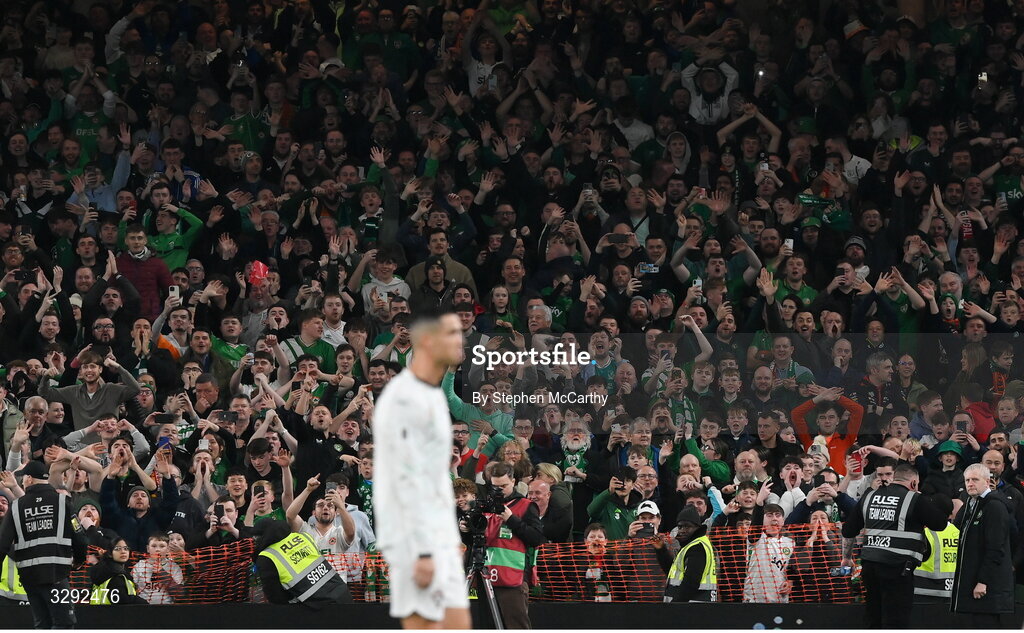 13 November 2025; Republic of Ireland supporters gesutre towards Cristiano Ronaldo of Portugal as he leaves the pitch after being sent off during the FIFA World Cup 2026 Group F Qualifier match between Republic of Ireland and Portugal at the Aviva Stadium in Dublin. Photo by Stephen McCarthy/Sportsfile