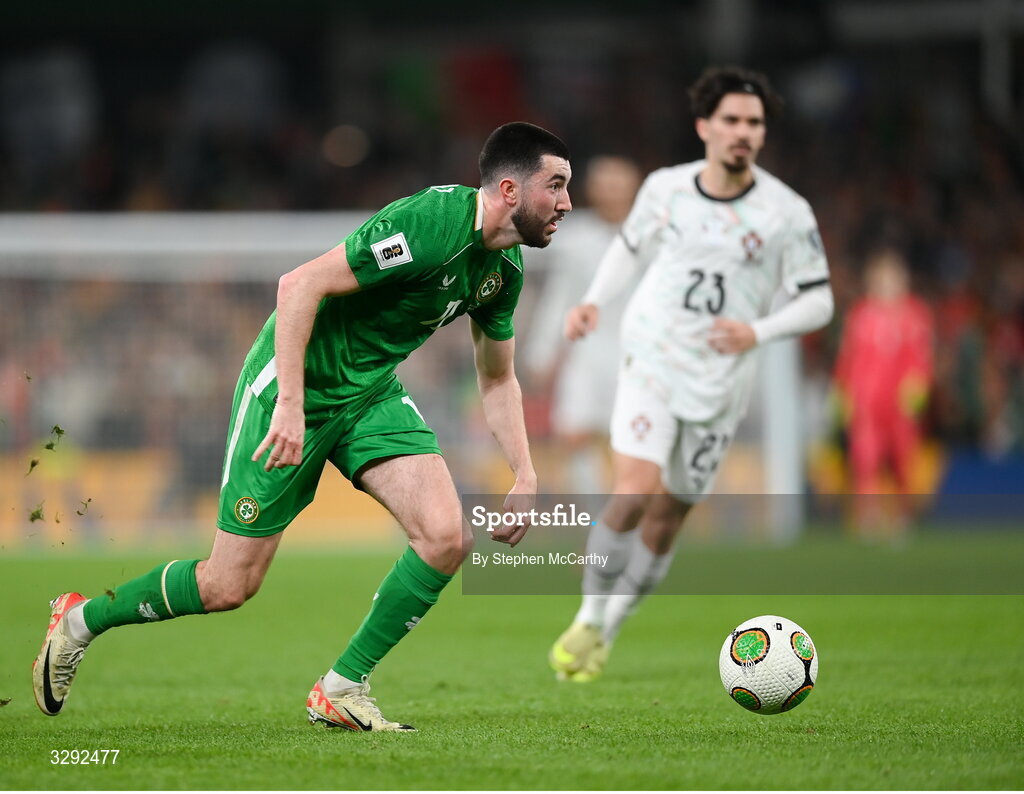 13 November 2025; Finn Azaz of Republic of Ireland during the FIFA World Cup 2026 Group F Qualifier match between Republic of Ireland and Portugal at the Aviva Stadium in Dublin. Photo by Stephen McCarthy/Sportsfile