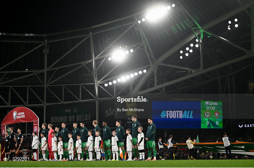 13 November 2025; Republic of Ireland players line-up before the FIFA World Cup 2026 Group F Qualifier match between Republic of Ireland and Portugal at the Aviva Stadium in Dublin. Photo by Ben McShane/Sportsfile