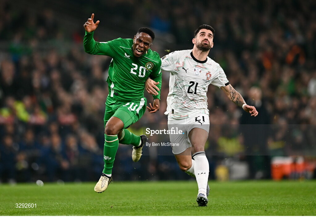 13 November 2025; Chiedozie Ogbene of Republic of Ireland and Rúben Neves of Portugal collide during the FIFA World Cup 2026 Group F Qualifier match between Republic of Ireland and Portugal at the Aviva Stadium in Dublin. Photo by Ben McShane/Sportsfile
