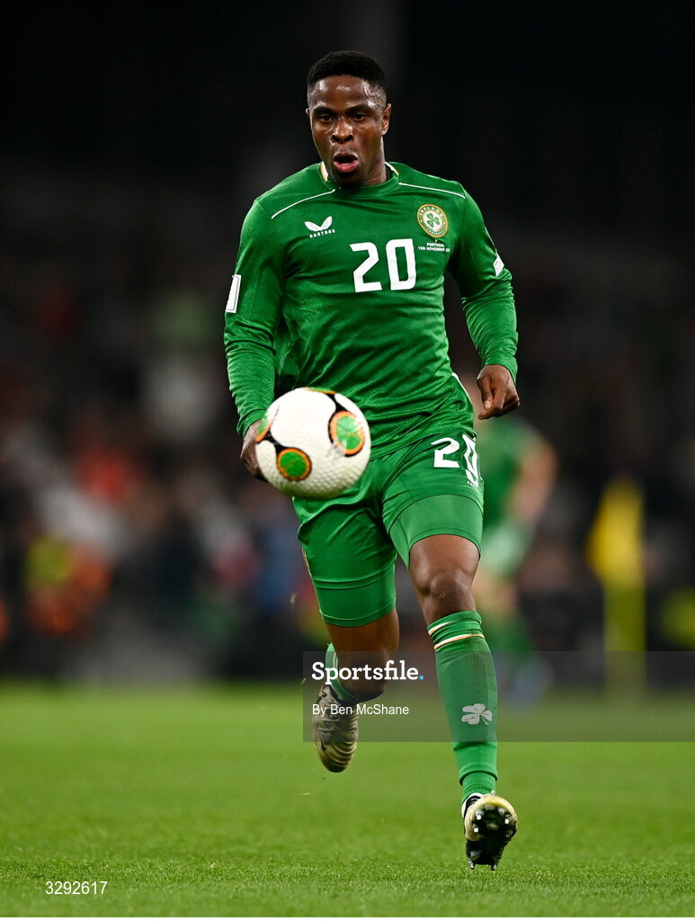13 November 2025; Chiedozie Ogbene of Republic of Ireland during the FIFA World Cup 2026 Group F Qualifier match between Republic of Ireland and Portugal at the Aviva Stadium in Dublin. Photo by Ben McShane/Sportsfile