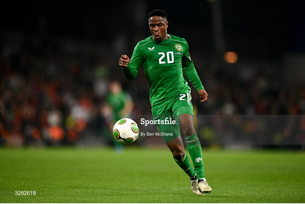 13 November 2025; Chiedozie Ogbene of Republic of Ireland during the FIFA World Cup 2026 Group F Qualifier match between Republic of Ireland and Portugal at the Aviva Stadium in Dublin. Photo by Ben McShane/Sportsfile