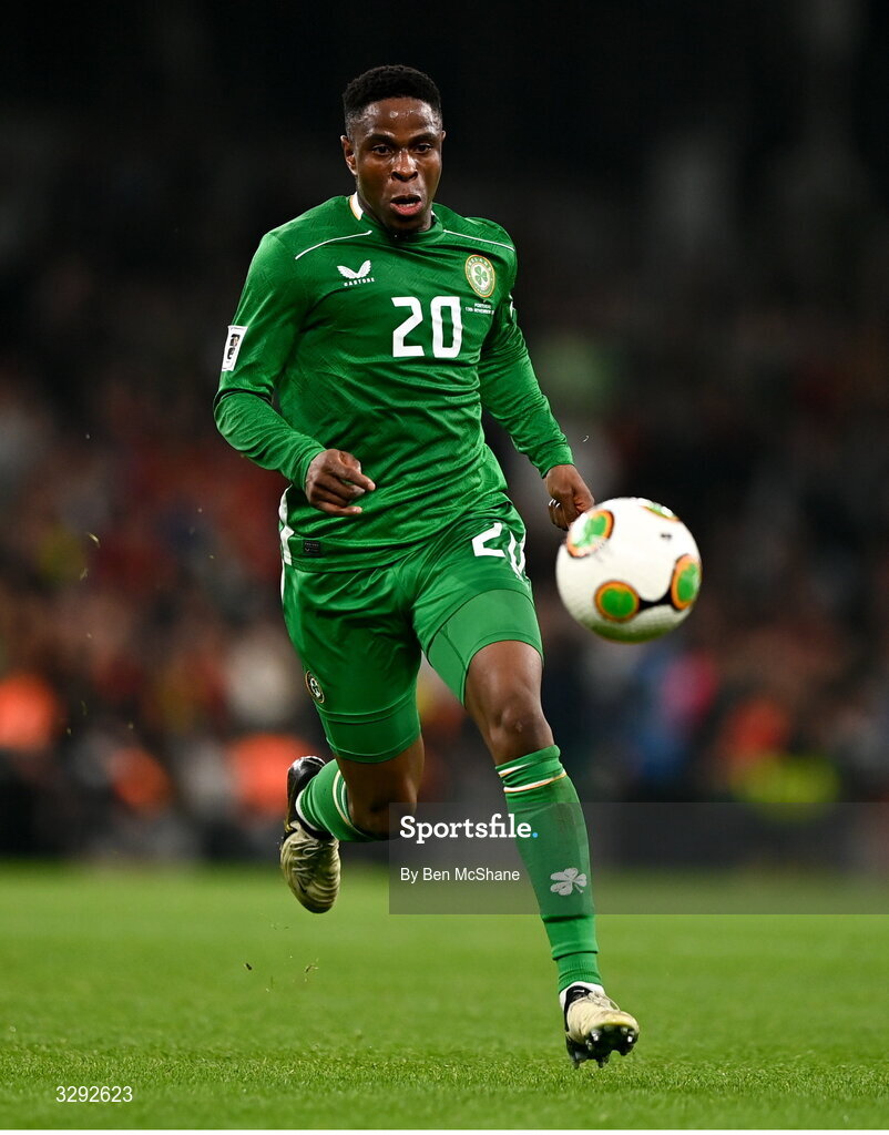 13 November 2025; Chiedozie Ogbene of Republic of Ireland during the FIFA World Cup 2026 Group F Qualifier match between Republic of Ireland and Portugal at the Aviva Stadium in Dublin. Photo by Ben McShane/Sportsfile