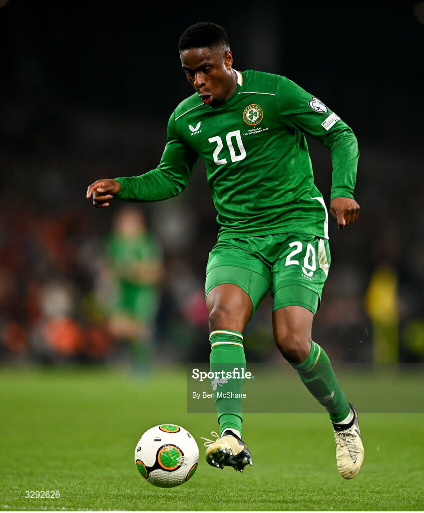 13 November 2025; Chiedozie Ogbene of Republic of Ireland during the FIFA World Cup 2026 Group F Qualifier match between Republic of Ireland and Portugal at the Aviva Stadium in Dublin. Photo by Ben McShane/Sportsfile