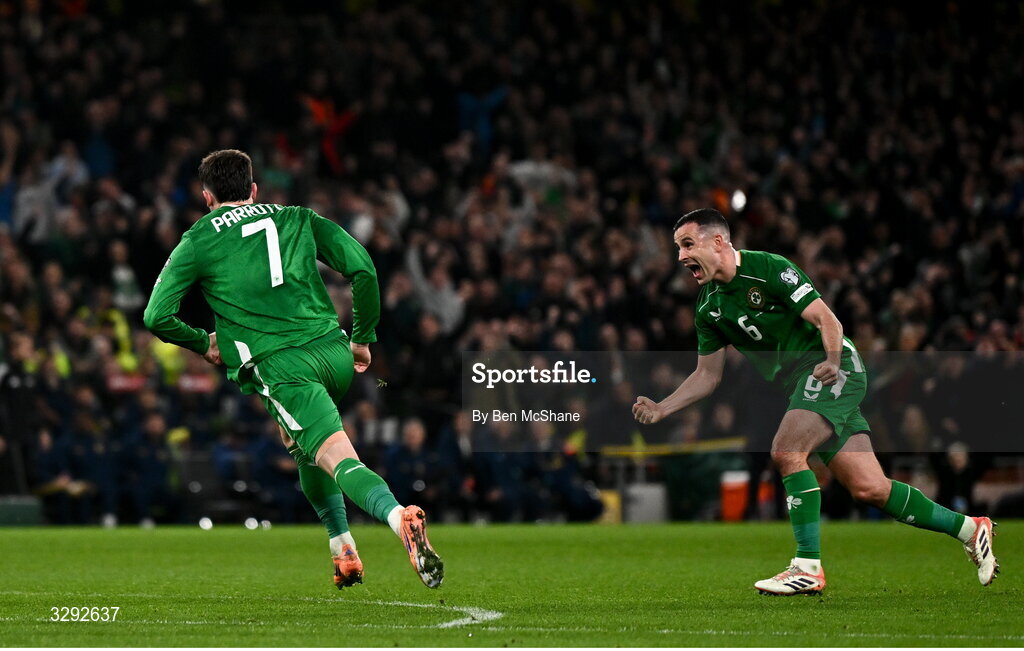 13 November 2025; Troy Parrott of Republic of Irelans celebrates with teammate Josh Cullen, right, after scoring their second goal during the FIFA World Cup 2026 Group F Qualifier match between Republic of Ireland and Portugal at the Aviva Stadium in Dublin. Photo by Ben McShane/Sportsfile