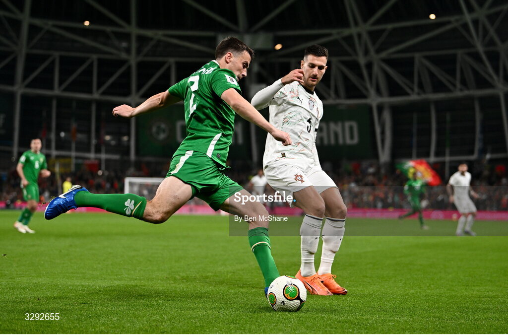 13 November 2025; Seamus Coleman of Republic of Ireland and Diogo Dalot of Portugal during the FIFA World Cup 2026 Group F Qualifier match between Republic of Ireland and Portugal at the Aviva Stadium in Dublin. Photo by Ben McShane/Sportsfile