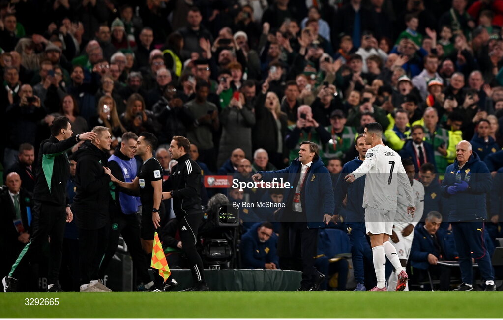 13 November 2025; Cristiano Ronaldo of Portugal exchanges words with Republic of Ireland head coach Heimir Hallgrimsson, left, after being sent off during the FIFA World Cup 2026 Group F Qualifier match between Republic of Ireland and Portugal at the Aviva Stadium in Dublin. Photo by Ben McShane/Sportsfile