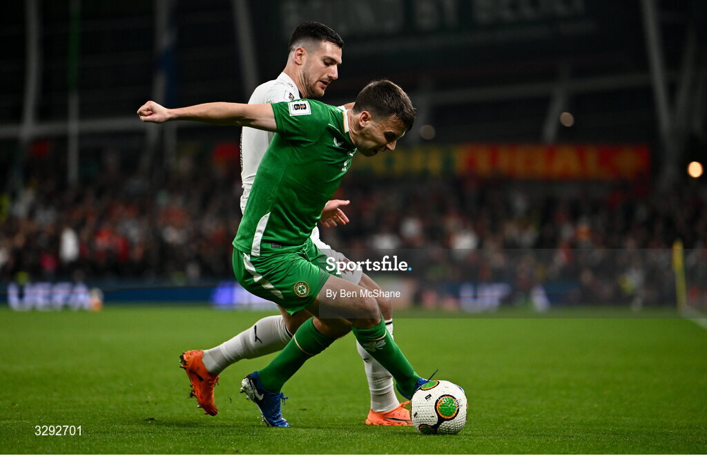 13 November 2025; Seamus Coleman of Republic of Ireland and Diogo Dalot of Portugal during the FIFA World Cup 2026 Group F Qualifier match between Republic of Ireland and Portugal at the Aviva Stadium in Dublin. Photo by Ben McShane/Sportsfile