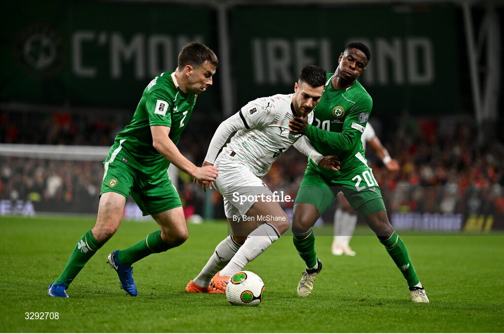 13 November 2025; Diogo Dalot of Portugal in action against Chiedozie Ogbene, right, and Seamus Coleman during the FIFA World Cup 2026 Group F Qualifier match between Republic of Ireland and Portugal at the Aviva Stadium in Dublin. Photo by Ben McShane/Sportsfile
