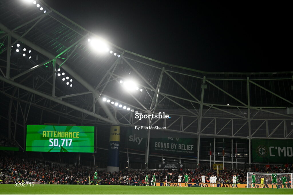 13 November 2025; The attendance is shown on the big screen during the FIFA World Cup 2026 Group F Qualifier match between Republic of Ireland and Portugal at the Aviva Stadium in Dublin. Photo by Ben McShane/Sportsfile