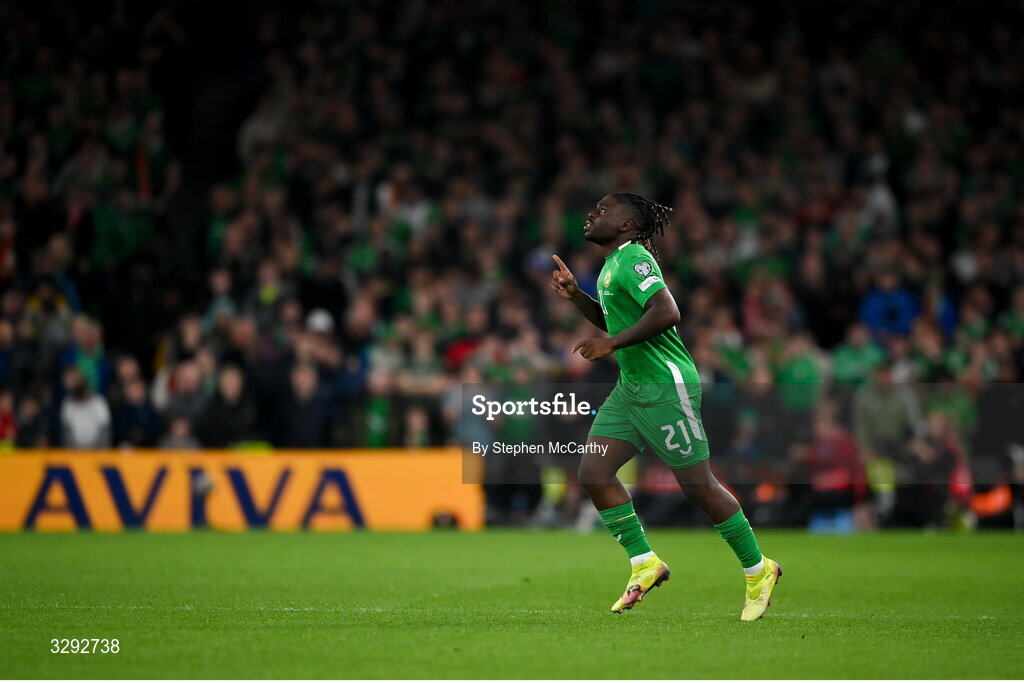 13 November 2025; Festy Ebosele of Republic of Ireland during the FIFA World Cup 2026 Group F Qualifier match between Republic of Ireland and Portugal at the Aviva Stadium in Dublin. Photo by Stephen McCarthy/Sportsfile