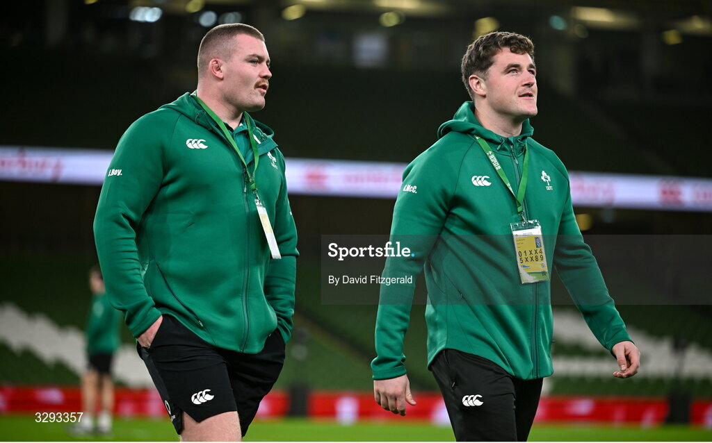 15 November 2025; Jack Boyle, left, and Gus McCarthy of Ireland before the Quilter Nations Series 2025 match between Ireland and Australia at the Aviva Stadium in Dublin. Photo by David Fitzgerald/Sportsfile