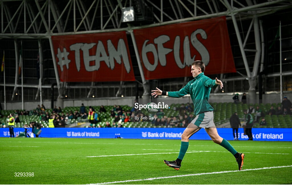 15 November 2025; Sam Prendergast of Ireland warms up before the Quilter Nations Series 2025 match between Ireland and Australia at the Aviva Stadium in Dublin. Photo by Seb Daly/Sportsfile