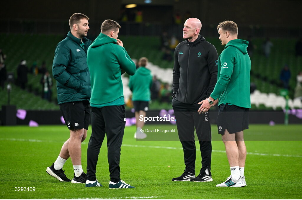 15 November 2025; Ireland forwards coach Paul O'Connell with Ireland players, from left, Iain Henderson, Garry Ringrose and Josh van der Flier before the Quilter Nations Series 2025 match between Ireland and Australia at the Aviva Stadium in Dublin. Photo by David Fitzgerald/Sportsfile