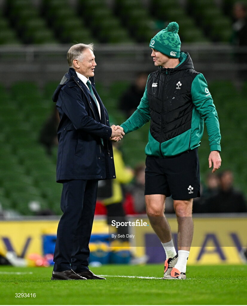 15 November 2025; Australia head coach Joe Schmidt and Ireland assistant coach Jonathan Sexton, right, before the Quilter Nations Series 2025 match between Ireland and Australia at the Aviva Stadium in Dublin. Photo by Seb Daly/Sportsfile