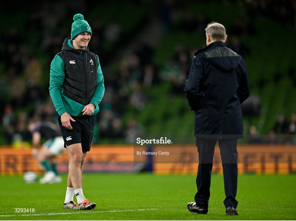 15 November 2025; Ireland assistant coach Jonathan Sexton and Australia head coach Joe Schmidt before the Quilter Nations Series 2025 match between Ireland and Australia at the Aviva Stadium in Dublin. Photo by Ramsey Cardy/Sportsfile