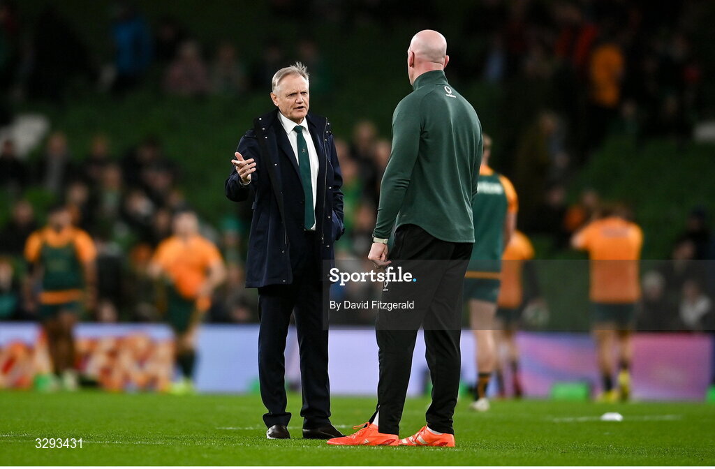 15 November 2025; Australia head coach Joe Schmidt, left, with Ireland forwards coach Paul O'Connell before the Quilter Nations Series 2025 match between Ireland and Australia at the Aviva Stadium in Dublin. Photo by David Fitzgerald/Sportsfile