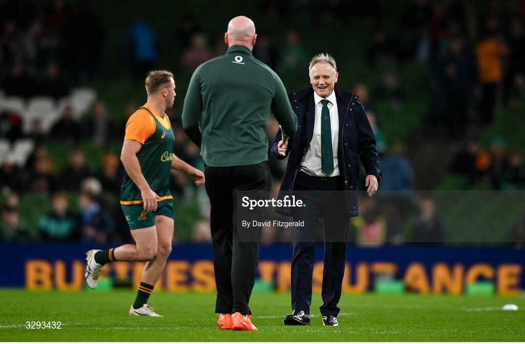 15 November 2025; Australia head coach Joe Schmidt, left, with Ireland forwards coach Paul O'Connell before the Quilter Nations Series 2025 match between Ireland and Australia at the Aviva Stadium in Dublin. Photo by David Fitzgerald/Sportsfile
