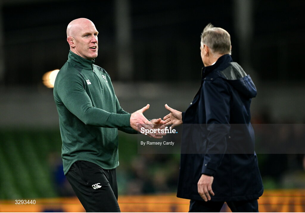 15 November 2025; Ireland forwards coach Paul O'Connell and Australia head coach Joe Schmidt, right, before the Quilter Nations Series 2025 match between Ireland and Australia at the Aviva Stadium in Dublin. Photo by Ramsey Cardy/Sportsfile