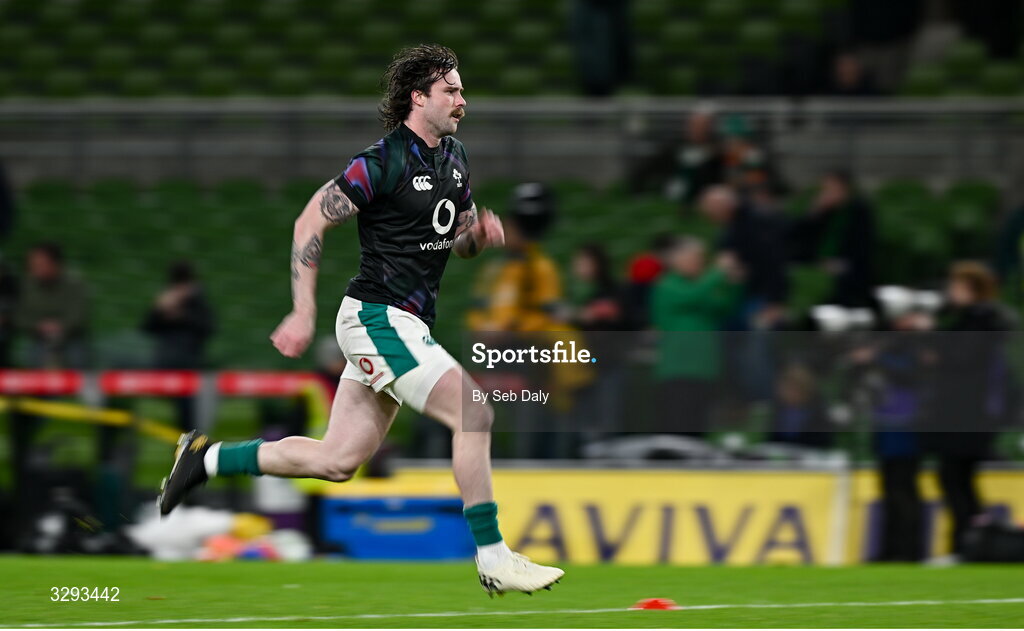 15 November 2025; Mack Hansen of Ireland warms up before the Quilter Nations Series 2025 match between Ireland and Australia at the Aviva Stadium in Dublin. Photo by Seb Daly/Sportsfile