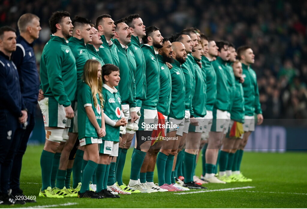 15 November 2025; Ireland players during the playing of Amhrán na bhFiann before the Quilter Nations Series 2025 match between Ireland and Australia at the Aviva Stadium in Dublin. Photo by David Fitzgerald/Sportsfile