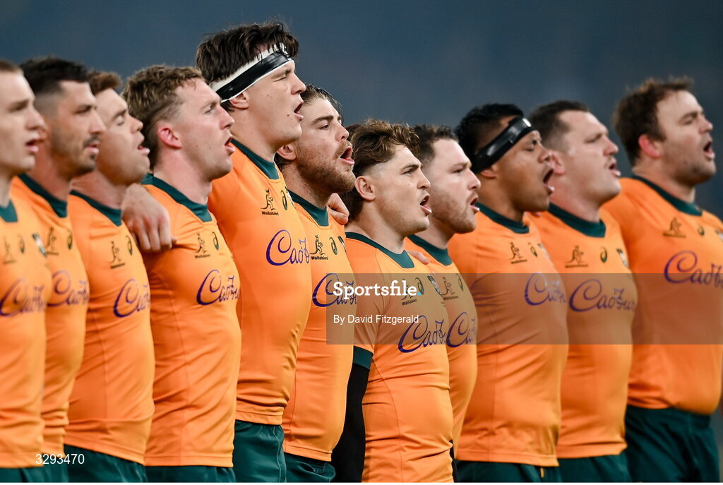 15 November 2025; Australia players during the playing of the Australian national anthem Advance Australia Fair before the Quilter Nations Series 2025 match between Ireland and Australia at the Aviva Stadium in Dublin. Photo by David Fitzgerald/Sportsfile
