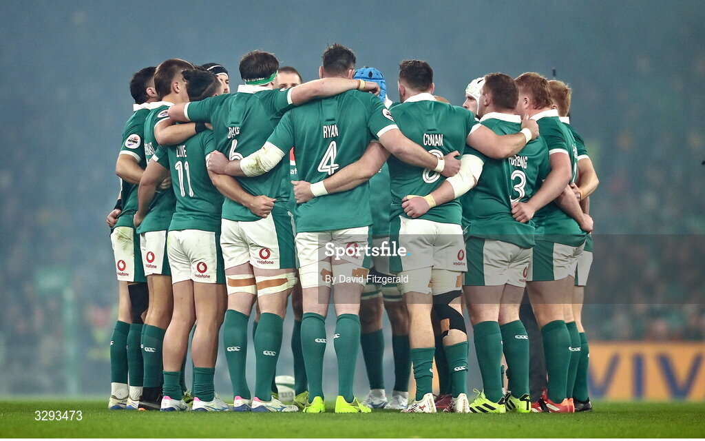 15 November 2025; Ireland players huddle before the Quilter Nations Series 2025 match between Ireland and Australia at the Aviva Stadium in Dublin. Photo by David Fitzgerald/Sportsfile