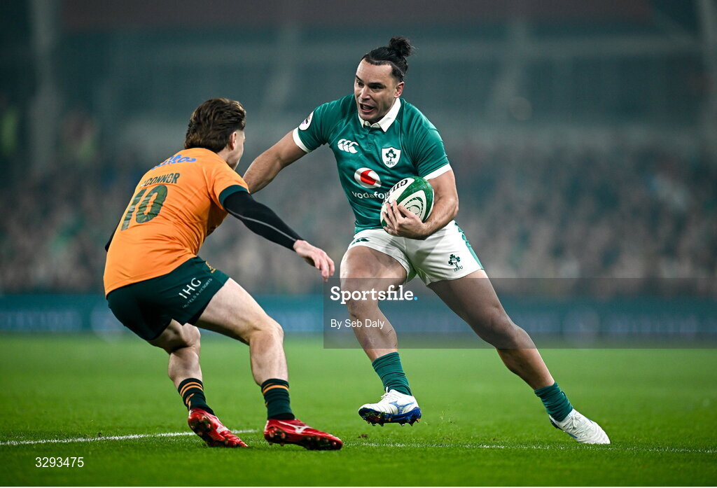 15 November 2025; James Lowe of Ireland in action against James O’Connor of Australia during the Quilter Nations Series 2025 match between Ireland and Australia at the Aviva Stadium in Dublin. Photo by Seb Daly/Sportsfile