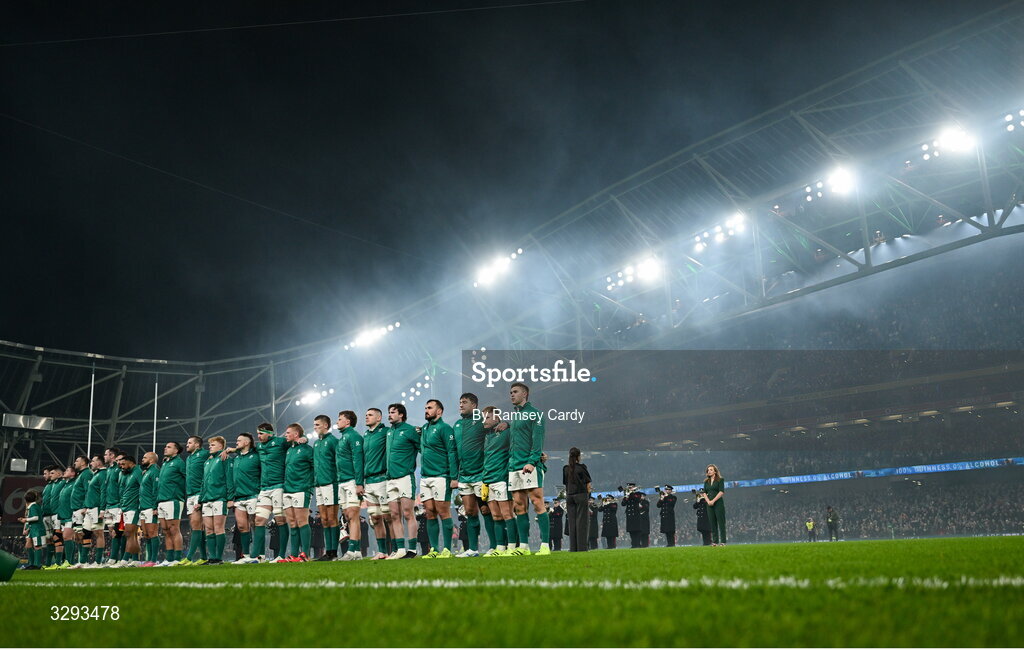 15 November 2025; Ireland players during the playing of the national anthems before the Quilter Nations Series 2025 match between Ireland and Australia at the Aviva Stadium in Dublin. Photo by Ramsey Cardy/Sportsfile
