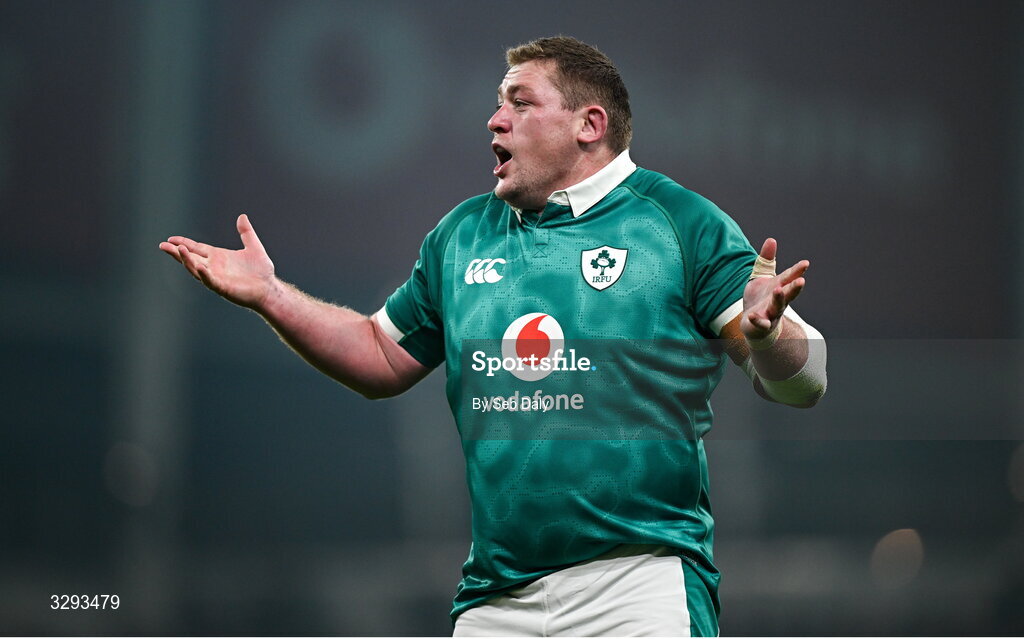 15 November 2025; Tadhg Furlong of Ireland reacts during the Quilter Nations Series 2025 match between Ireland and Australia at the Aviva Stadium in Dublin. Photo by Seb Daly/Sportsfile