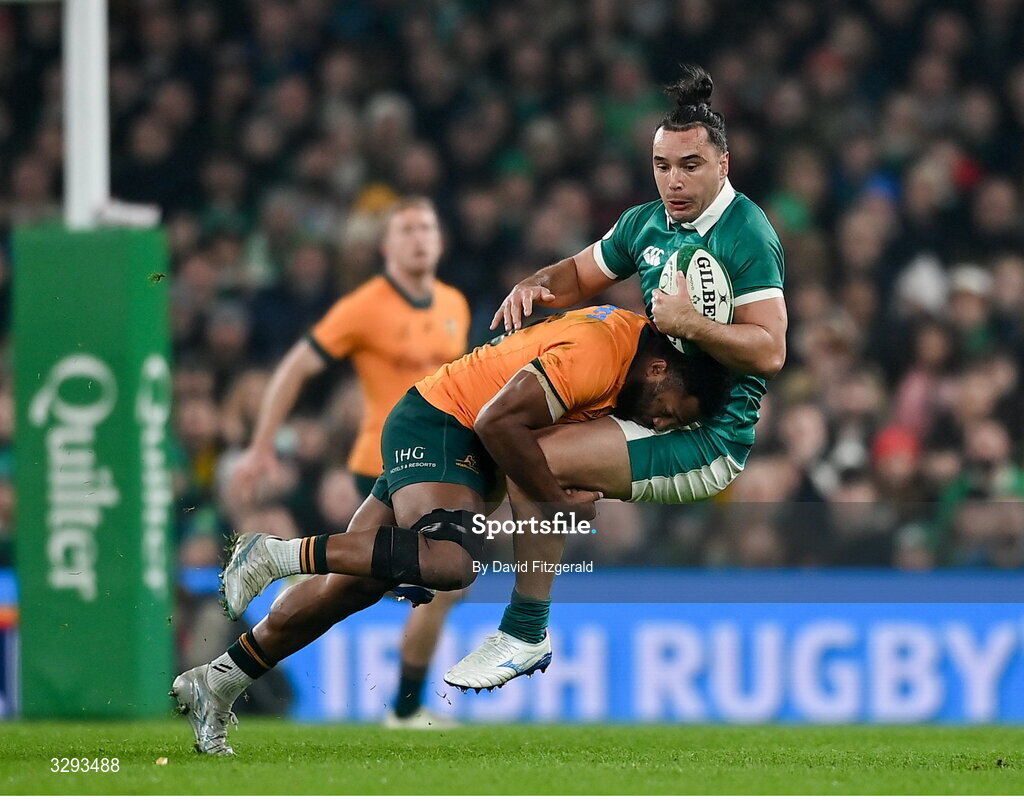15 November 2025; James Lowe of Ireland is tackled by Filipo Daugunu of Australia during the Quilter Nations Series 2025 match between Ireland and Australia at the Aviva Stadium in Dublin. Photo by David Fitzgerald/Sportsfile