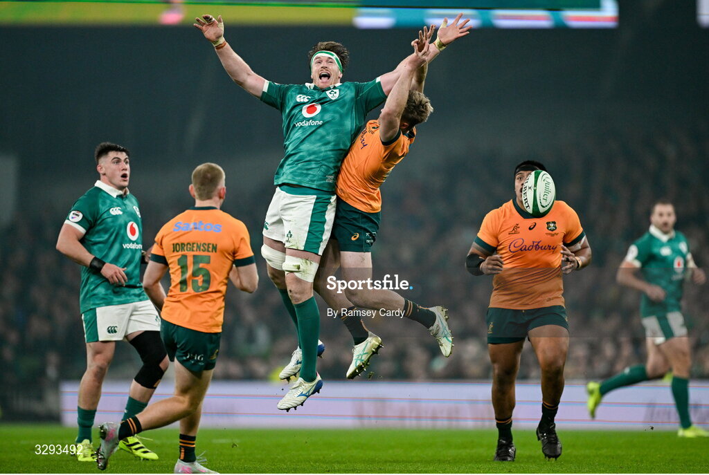 15 November 2025; Ryan Baird of Ireland in action against Harry Potter of Australia during the Quilter Nations Series 2025 match between Ireland and Australia at the Aviva Stadium in Dublin. Photo by Ramsey Cardy/Sportsfile