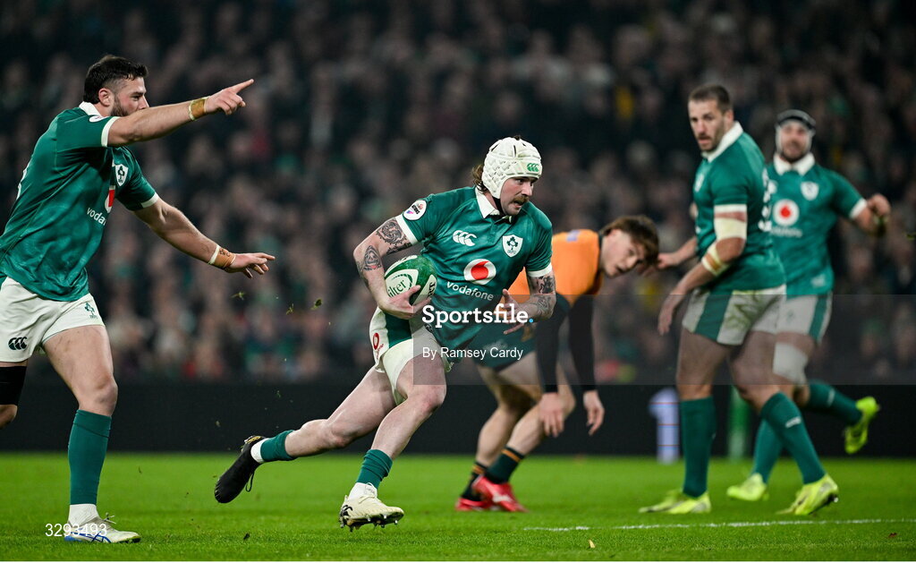 15 November 2025; Mack Hansen of Ireland runs in to score his side's first try during the Quilter Nations Series 2025 match between Ireland and Australia at the Aviva Stadium in Dublin. Photo by Ramsey Cardy/Sportsfile