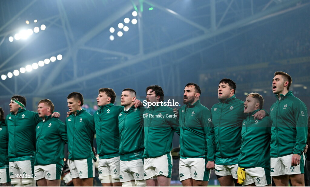 15 November 2025; Ireland players during the playing of the national anthems before the Quilter Nations Series 2025 match between Ireland and Australia at the Aviva Stadium in Dublin. Photo by Ramsey Cardy/Sportsfile