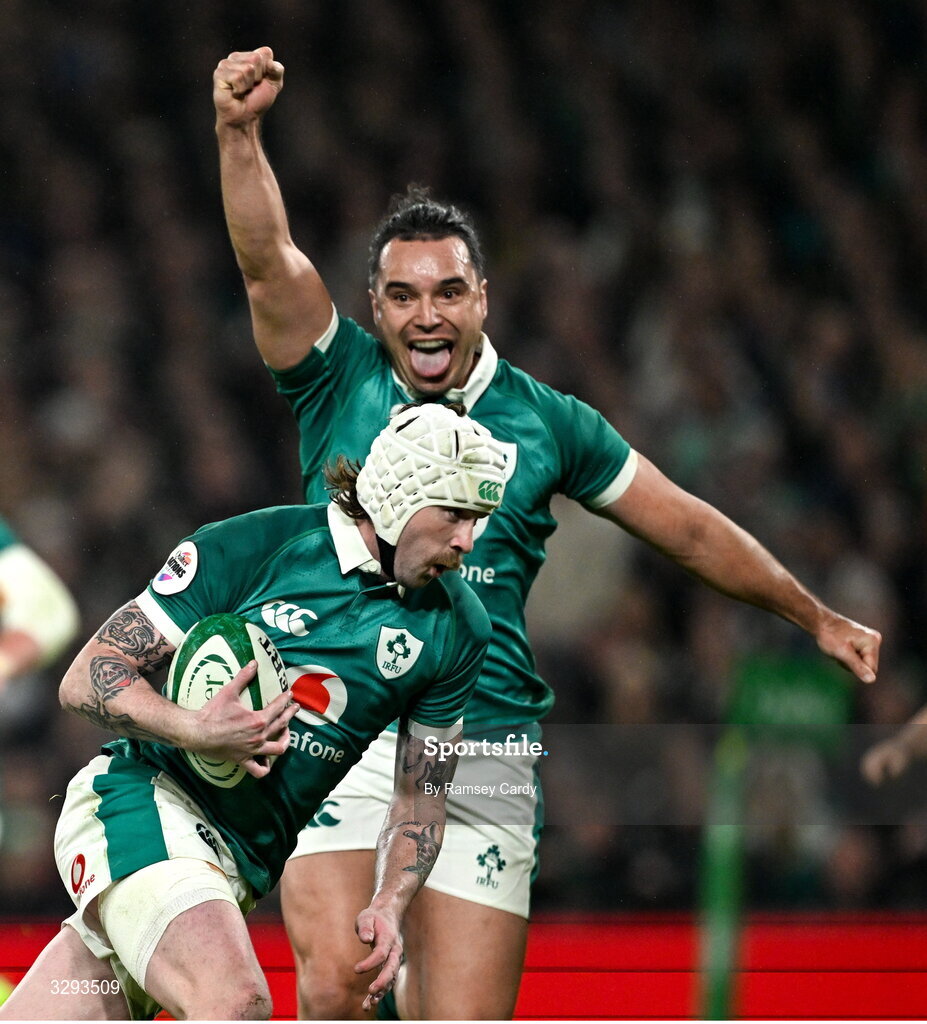 15 November 2025; Mack Hansen of Ireland on his way to scoring his side's second try, as team-mate James Lowe celebrates during the Quilter Nations Series 2025 match between Ireland and Australia at the Aviva Stadium in Dublin. Photo by Ramsey Cardy/Sportsfile