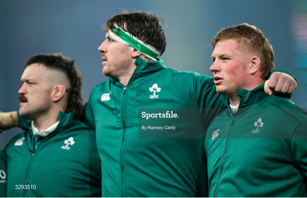 15 November 2025; Ireland players, from right, Paddy McCarthy, Ryan Baird and Andrew Porter before the Quilter Nations Series 2025 match between Ireland and Australia at the Aviva Stadium in Dublin. Photo by Ramsey Cardy/Sportsfile