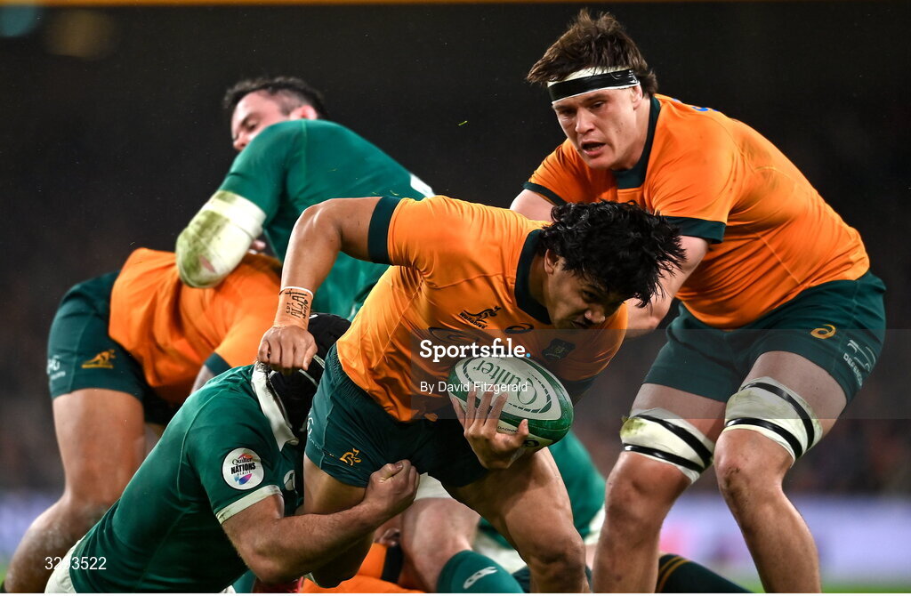 15 November 2025; Len Ikitau of Australia is tackled by Caelan Doris of Ireland during the Quilter Nations Series 2025 match between Ireland and Australia at the Aviva Stadium in Dublin. Photo by David Fitzgerald/Sportsfile