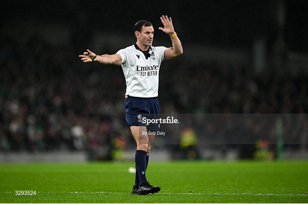 15 November 2025; Referee Karl Dickson during the Quilter Nations Series 2025 match between Ireland and Australia at the Aviva Stadium in Dublin. Photo by Seb Daly/Sportsfile