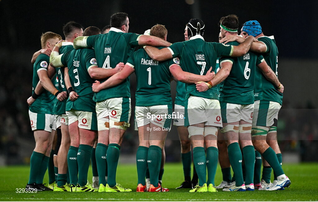 15 November 2025; Ireland players huddle during the Quilter Nations Series 2025 match between Ireland and Australia at the Aviva Stadium in Dublin. Photo by Seb Daly/Sportsfile