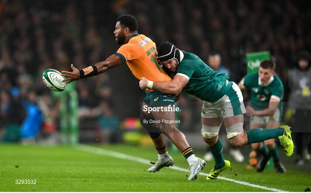 15 November 2025; Filipo Daugunu of Australia is tackled by Caelan Doris of Ireland during the Quilter Nations Series 2025 match between Ireland and Australia at the Aviva Stadium in Dublin. Photo by David Fitzgerald/Sportsfile