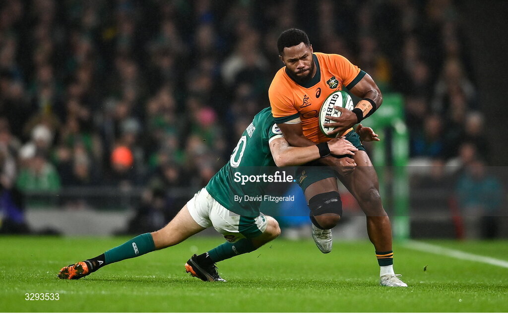 15 November 2025; Filipo Daugunu of Australia is tackled by Sam Prendergast of Ireland during the Quilter Nations Series 2025 match between Ireland and Australia at the Aviva Stadium in Dublin. Photo by David Fitzgerald/Sportsfile